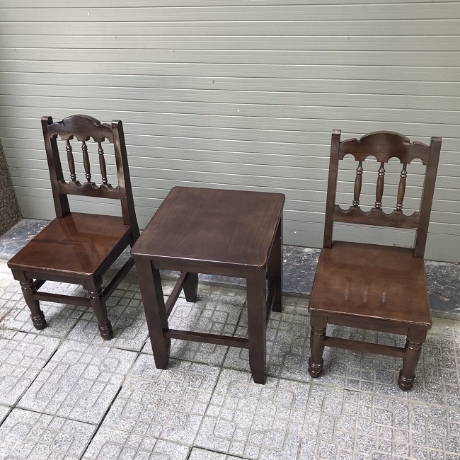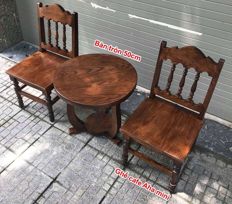 Bạn dễ dàng bắt gặp mẫu bàn ghế gỗ cafe mini tại các quán cà phê có diện tích không gian nhỏ hay ở các quán phục vụ ngoài vỉa hè. Trọn bộ sản phẩm này được làm từ 100% gỗ. Phần mặt lưng và chỗ ngồi làm từ nan gỗ. Có một số sản phẩm cách điệu họ kết hợp các nan gỗ với khung sắt tĩnh điện tạo thành một kết cấu vững chắc và đẹp mắt.