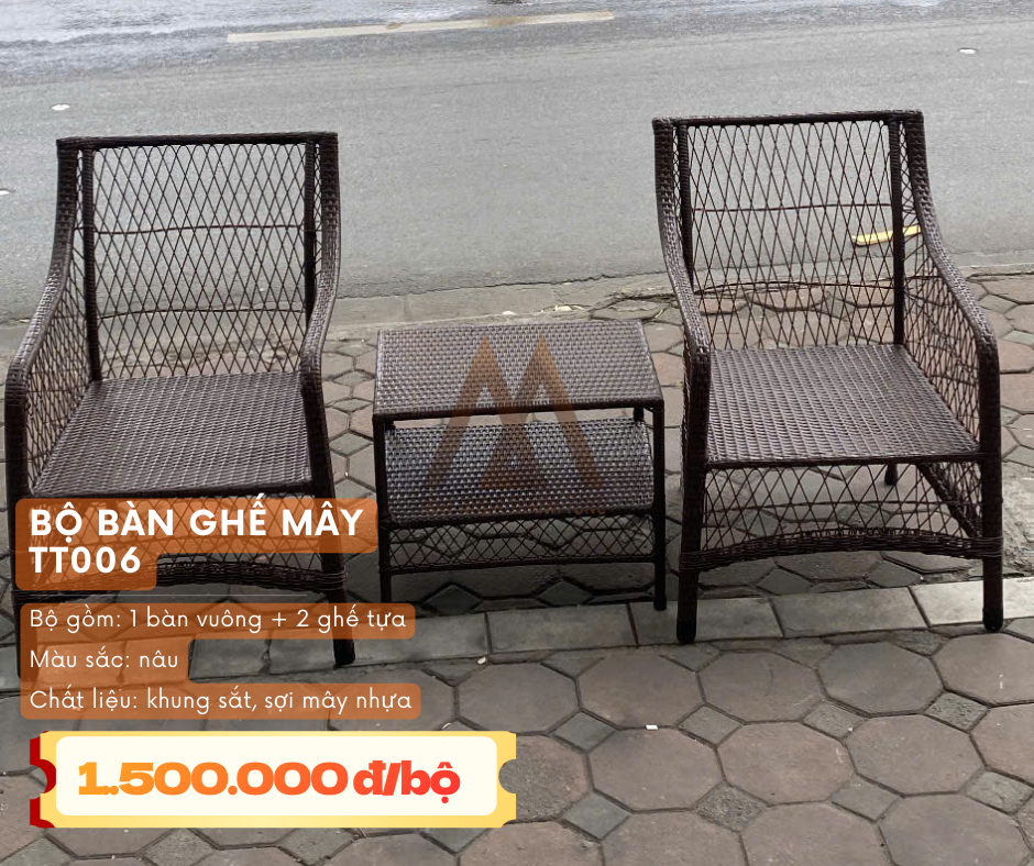 Trên thị trường, giá bàn ghế mây nhựa thường dao động từ vài trăm nghìn đồng đến vài triệu đồng cho một bộ bàn ghế, tùy thuộc vào kích thước và số lượng của một bộ bàn ghế.