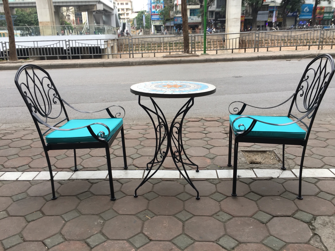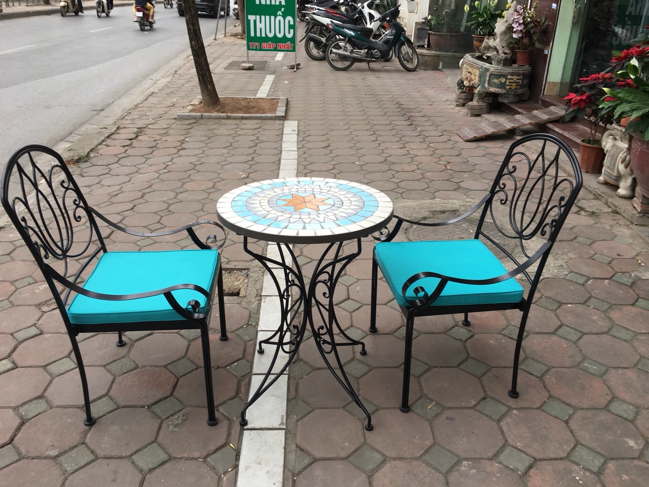 . Quy cách: 04 ghế sắt tựa + 01 bàn tròn mặt đá mosaic. Hoa văn uốn gia công.
