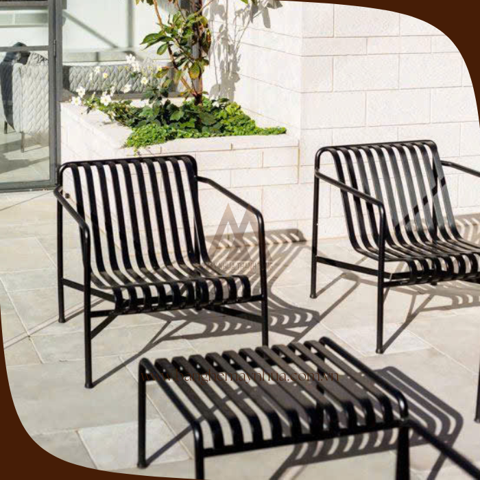 . Loại bàn ghế: sắt nghệ thuật. Bộ gồm 02 ghế tựa đơn + 01 bàn sắt đặc vuông.